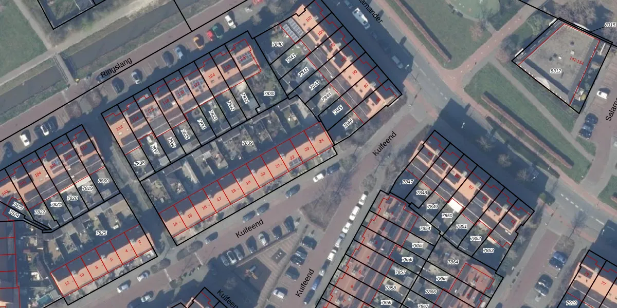 Kuifeend 23 is gelegen op kadastraal perceel ASV00O7839. Deze kadastrale aanduiding is uniek en wordt gebruikt door het Kadaster om eigendomsrechten en andere zakelijke rechten vast te leggen. Het perceel maakt onderdeel uit van de kadastrale gemeente Amstelveen.
