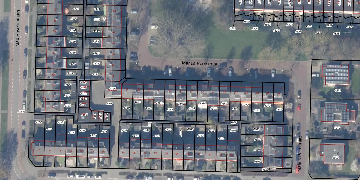 Manus Peetstraat 27 is gelegen op kadastraal perceel ASV00I4164. Deze kadastrale aanduiding is uniek en wordt gebruikt door het Kadaster om eigendomsrechten en andere zakelijke rechten vast te leggen. Het perceel maakt onderdeel uit van de kadastrale gemeente Amstelveen.