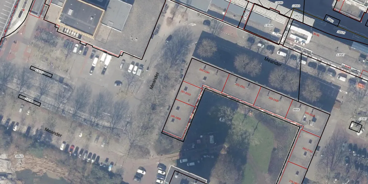 Het perceel waarop Meander 199 staat heeft een oppervlakte van 2860 m². Dit is een zeer groot perceel. De perceeloppervlakte wordt geregistreerd door het Kadaster. Gedetailleerde informatie over de maten van dit perceel kunt u vinden in het rapport Kadastrale kaart met maatvoering van Meander 199.