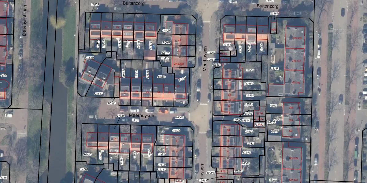 Het perceel waarop Meerhuysen 37 staat heeft een oppervlakte van 175 m². Dit is een middelgroot perceel. De perceeloppervlakte wordt geregistreerd door het Kadaster. Gedetailleerde informatie over de maten van dit perceel kunt u vinden in het rapport Kadastrale kaart met maatvoering van Meerhuysen 37.