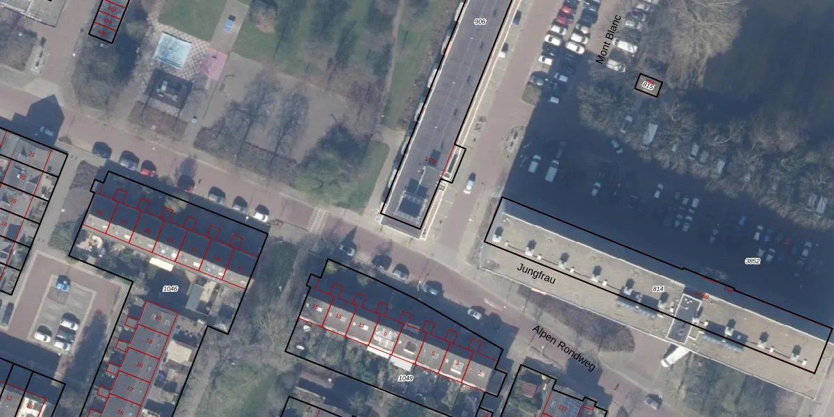 Het perceel waarop Mont Blanc 1-A staat heeft een oppervlakte van 950 m². Dit is een groot perceel. De perceeloppervlakte wordt geregistreerd door het Kadaster. Gedetailleerde informatie over de maten van dit perceel kunt u vinden in het rapport Kadastrale kaart met maatvoering van Mont Blanc 1-A.