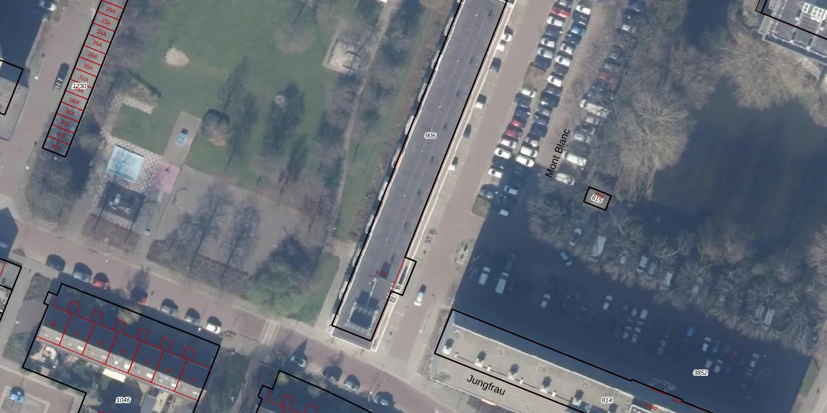 Het perceel waarop Mont Blanc 5-A staat heeft een oppervlakte van 950 m². Dit is een groot perceel. De perceeloppervlakte wordt geregistreerd door het Kadaster. Gedetailleerde informatie over de maten van dit perceel kunt u vinden in het rapport Kadastrale kaart met maatvoering van Mont Blanc 5-A.