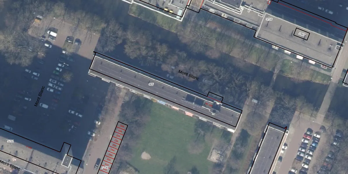 Het perceel waarop Mont Blanc 87-A staat heeft een oppervlakte van 949 m². Dit is een groot perceel. De perceeloppervlakte wordt geregistreerd door het Kadaster. Gedetailleerde informatie over de maten van dit perceel kunt u vinden in het rapport Kadastrale kaart met maatvoering van Mont Blanc 87-A.