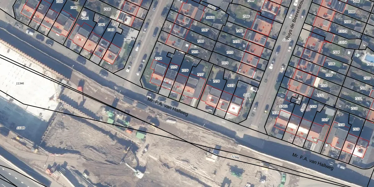 Mr. F.A. van Hallweg 33 is gelegen op kadastraal perceel ASV00H7277. Deze kadastrale aanduiding is uniek en wordt gebruikt door het Kadaster om eigendomsrechten en andere zakelijke rechten vast te leggen. Het perceel maakt onderdeel uit van de kadastrale gemeente Amstelveen.