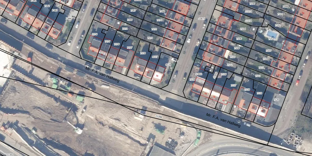 Mr. F.A. van Hallweg 36 is gelegen op kadastraal perceel ASV00H9118. Deze kadastrale aanduiding is uniek en wordt gebruikt door het Kadaster om eigendomsrechten en andere zakelijke rechten vast te leggen. Het perceel maakt onderdeel uit van de kadastrale gemeente Amstelveen.