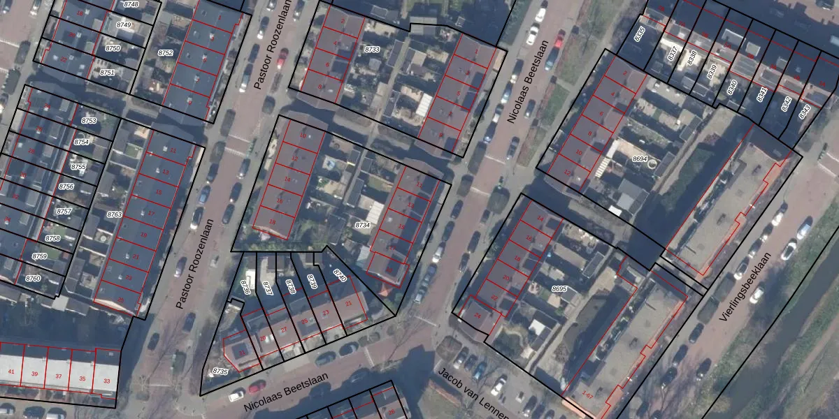 Nicolaas Beetslaan 13 is gelegen op kadastraal perceel ASV00O8734. Deze kadastrale aanduiding is uniek en wordt gebruikt door het Kadaster om eigendomsrechten en andere zakelijke rechten vast te leggen. Het perceel maakt onderdeel uit van de kadastrale gemeente Amstelveen.