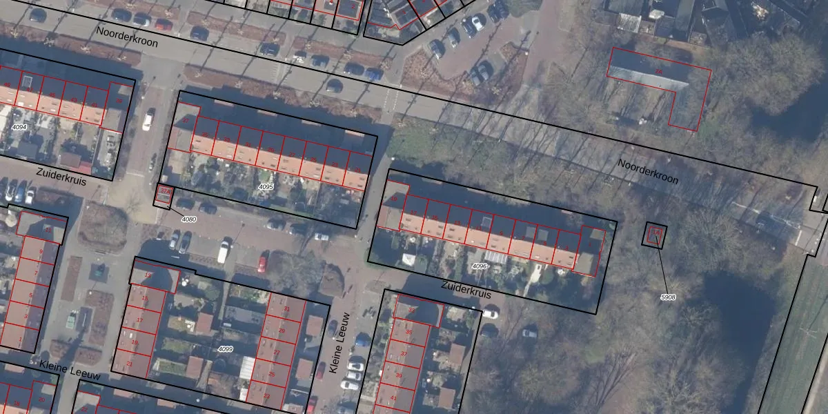 Het perceel waarop Noorderkroon 17 staat heeft een oppervlakte van 1297 m². Dit is een zeer groot perceel. De perceeloppervlakte wordt geregistreerd door het Kadaster. Gedetailleerde informatie over de maten van dit perceel kunt u vinden in het rapport Kadastrale kaart met maatvoering van Noorderkroon 17.