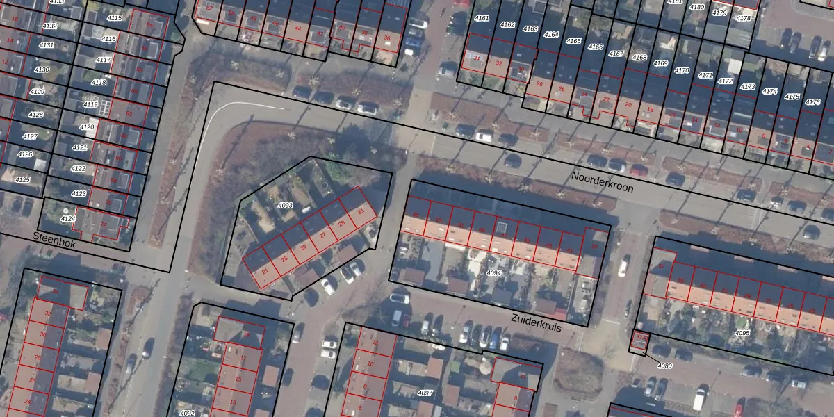 Het perceel waarop Noorderkroon 55 staat heeft een oppervlakte van 1222 m². Dit is een zeer groot perceel. De perceeloppervlakte wordt geregistreerd door het Kadaster. Gedetailleerde informatie over de maten van dit perceel kunt u vinden in het rapport Kadastrale kaart met maatvoering van Noorderkroon 55.