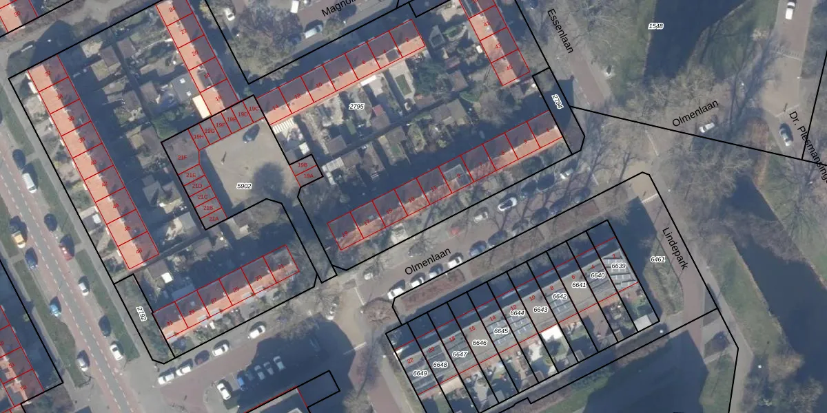 Het perceel waarop Olmenlaan 13 staat heeft een oppervlakte van 6396 m². Dit is een zeer groot perceel. De perceeloppervlakte wordt geregistreerd door het Kadaster. Gedetailleerde informatie over de maten van dit perceel kunt u vinden in het rapport Kadastrale kaart met maatvoering van Olmenlaan 13.
