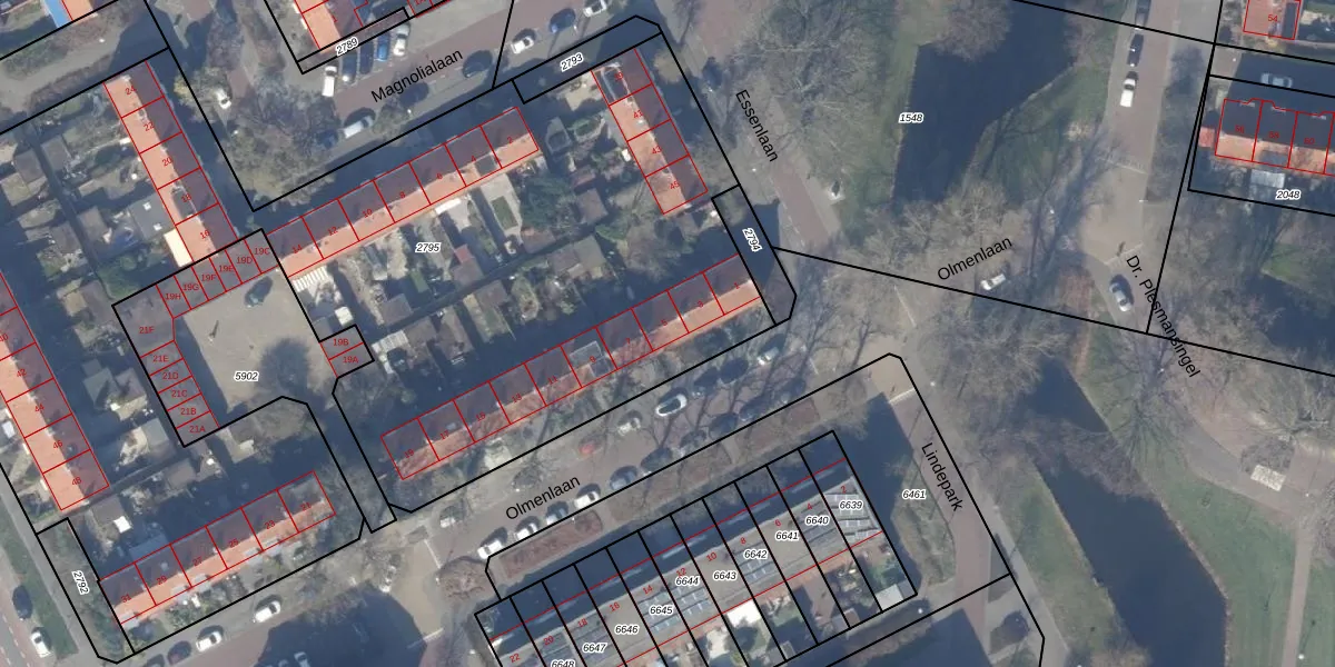 Het perceel waarop Olmenlaan 5 staat heeft een oppervlakte van 6396 m². Dit is een zeer groot perceel. De perceeloppervlakte wordt geregistreerd door het Kadaster. Gedetailleerde informatie over de maten van dit perceel kunt u vinden in het rapport Kadastrale kaart met maatvoering van Olmenlaan 5.