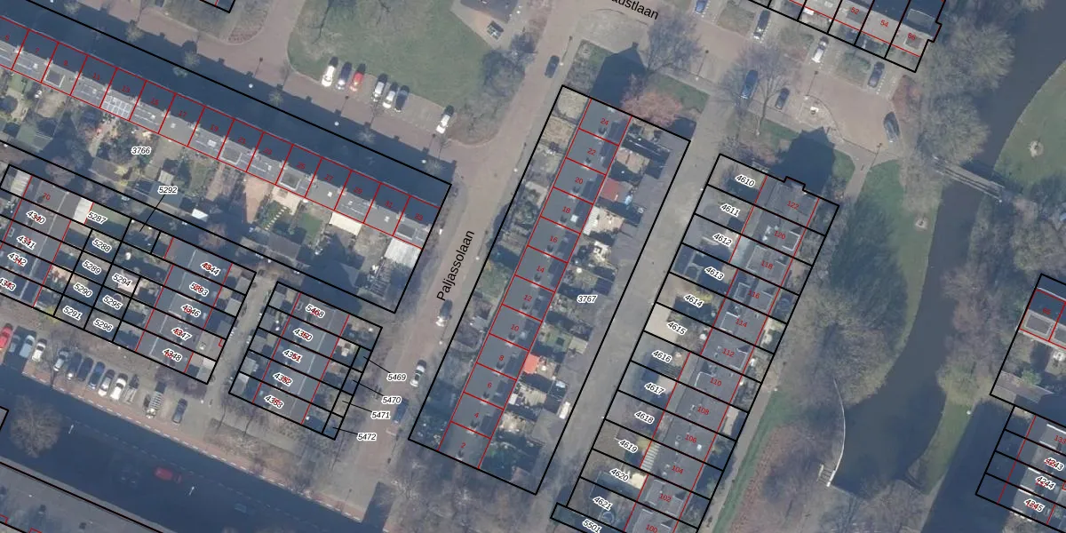 Het perceel waarop Paljassolaan 14 staat heeft een oppervlakte van 1895 m². Dit is een zeer groot perceel. De perceeloppervlakte wordt geregistreerd door het Kadaster. Gedetailleerde informatie over de maten van dit perceel kunt u vinden in het rapport Kadastrale kaart met maatvoering van Paljassolaan 14.