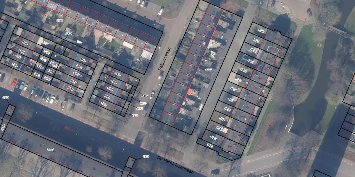 Het perceel waarop Paljassolaan 8 staat heeft een oppervlakte van 1895 m². Dit is een zeer groot perceel. De perceeloppervlakte wordt geregistreerd door het Kadaster. Gedetailleerde informatie over de maten van dit perceel kunt u vinden in het rapport Kadastrale kaart met maatvoering van Paljassolaan 8.