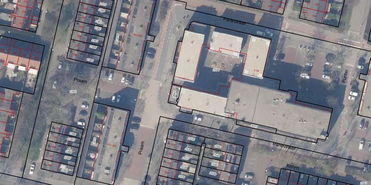 Parlevinker 39 is gelegen op kadastraal perceel ASV00L2594. Deze kadastrale aanduiding is uniek en wordt gebruikt door het Kadaster om eigendomsrechten en andere zakelijke rechten vast te leggen. Het perceel maakt onderdeel uit van de kadastrale gemeente Amstelveen.