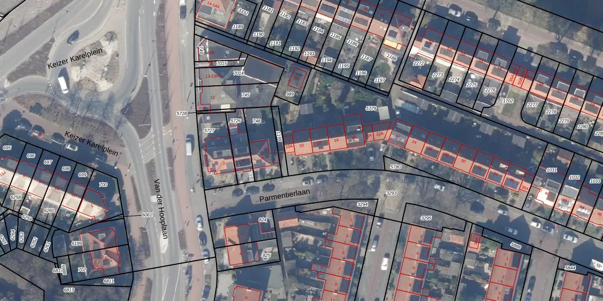 Parmentierlaan 10 is gelegen op kadastraal perceel ASV00M5779. Deze kadastrale aanduiding is uniek en wordt gebruikt door het Kadaster om eigendomsrechten en andere zakelijke rechten vast te leggen. Het perceel maakt onderdeel uit van de kadastrale gemeente Amstelveen.