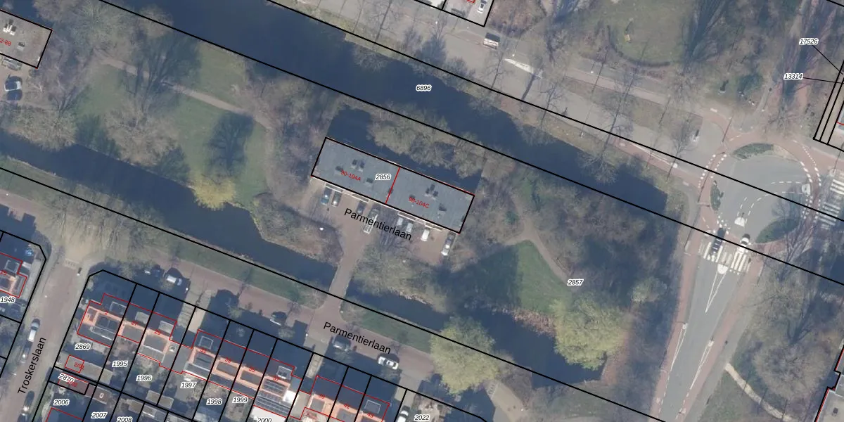 Parmentierlaan 102 is gelegen op kadastraal perceel ASV00M2856. Deze kadastrale aanduiding is uniek en wordt gebruikt door het Kadaster om eigendomsrechten en andere zakelijke rechten vast te leggen. Het perceel maakt onderdeel uit van de kadastrale gemeente Amstelveen.