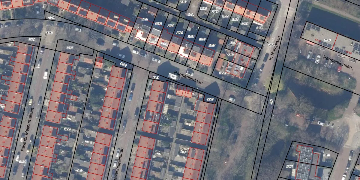Het perceel waarop Parmentierlaan 50-A staat heeft een oppervlakte van 6493 m². Dit is een zeer groot perceel. De perceeloppervlakte wordt geregistreerd door het Kadaster. Gedetailleerde informatie over de maten van dit perceel kunt u vinden in het rapport Kadastrale kaart met maatvoering van Parmentierlaan 50-A.