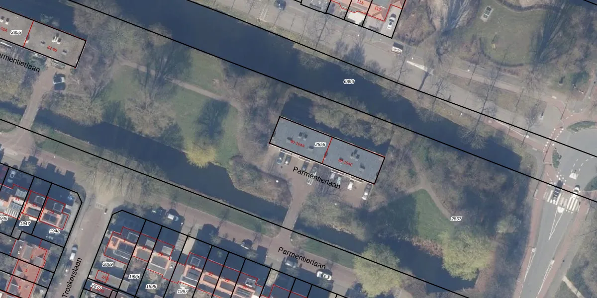 Parmentierlaan 96 is gelegen op kadastraal perceel ASV00M2856. Deze kadastrale aanduiding is uniek en wordt gebruikt door het Kadaster om eigendomsrechten en andere zakelijke rechten vast te leggen. Het perceel maakt onderdeel uit van de kadastrale gemeente Amstelveen.