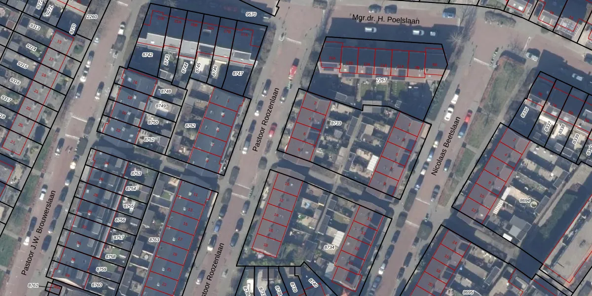 Pastoor Roozenlaan 8 is gelegen op kadastraal perceel ASV00O8733. Deze kadastrale aanduiding is uniek en wordt gebruikt door het Kadaster om eigendomsrechten en andere zakelijke rechten vast te leggen. Het perceel maakt onderdeel uit van de kadastrale gemeente Amstelveen.