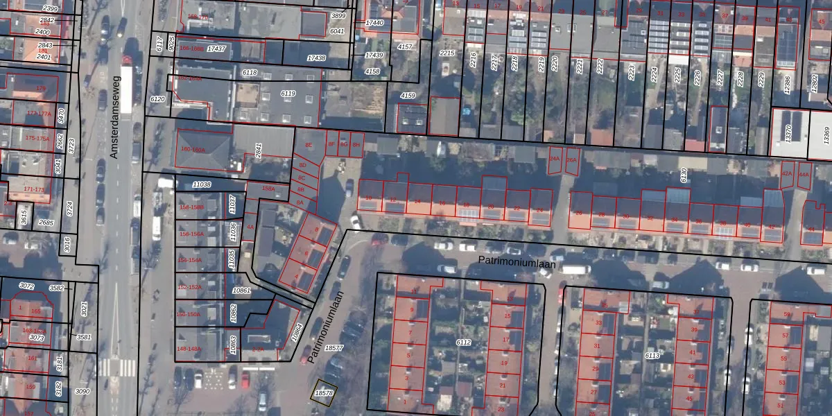 Patrimoniumlaan 14 is gelegen op kadastraal perceel ASV00H6130. Deze kadastrale aanduiding is uniek en wordt gebruikt door het Kadaster om eigendomsrechten en andere zakelijke rechten vast te leggen. Het perceel maakt onderdeel uit van de kadastrale gemeente Amstelveen.