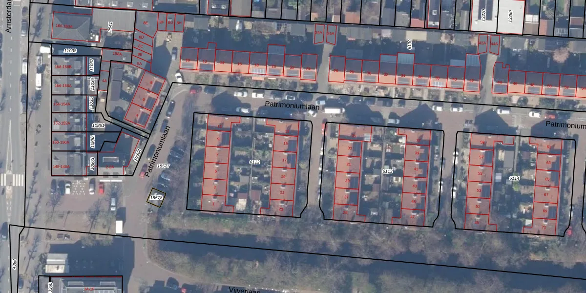 Patrimoniumlaan 15 is gelegen op kadastraal perceel ASV00H6112. Deze kadastrale aanduiding is uniek en wordt gebruikt door het Kadaster om eigendomsrechten en andere zakelijke rechten vast te leggen. Het perceel maakt onderdeel uit van de kadastrale gemeente Amstelveen.