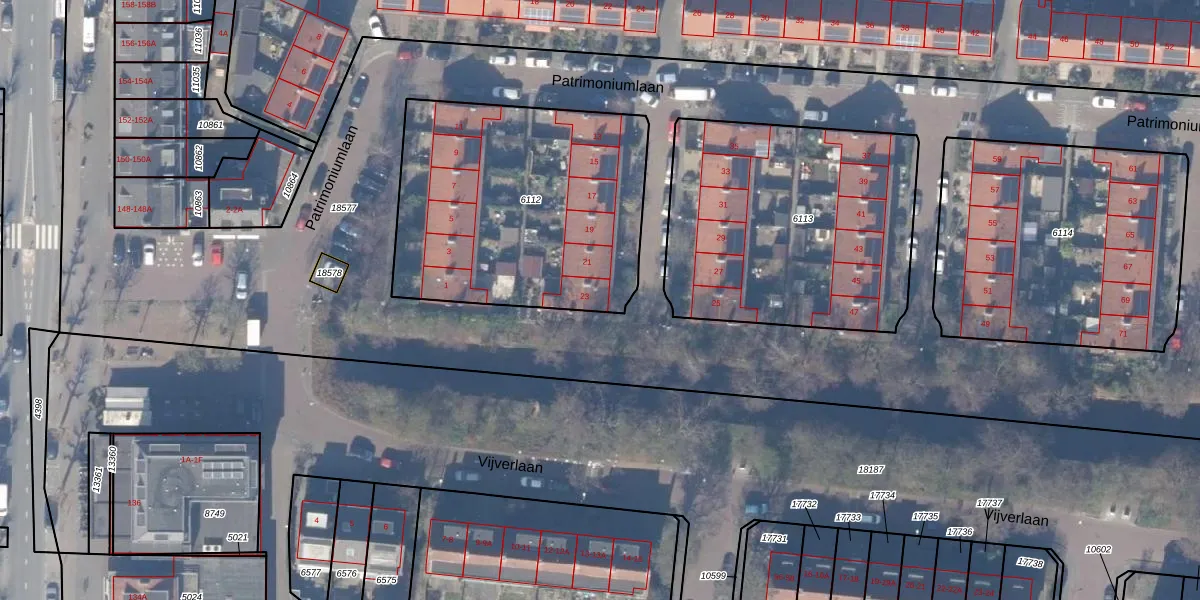 Patrimoniumlaan 23 is gelegen op kadastraal perceel ASV00H6112. Deze kadastrale aanduiding is uniek en wordt gebruikt door het Kadaster om eigendomsrechten en andere zakelijke rechten vast te leggen. Het perceel maakt onderdeel uit van de kadastrale gemeente Amstelveen.