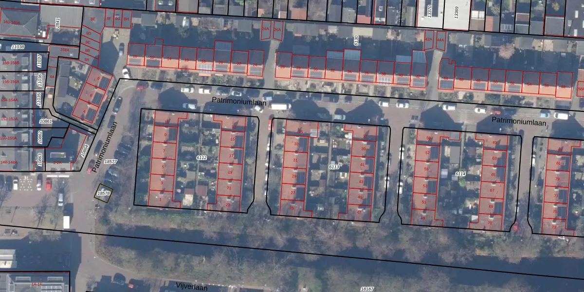 Het perceel waarop Patrimoniumlaan 33 staat heeft een oppervlakte van 1337 m². Dit is een zeer groot perceel. De perceeloppervlakte wordt geregistreerd door het Kadaster. Gedetailleerde informatie over de maten van dit perceel kunt u vinden in het rapport Kadastrale kaart met maatvoering van Patrimoniumlaan 33.