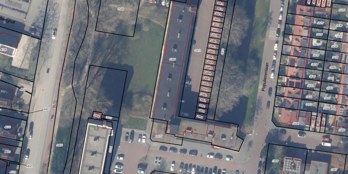 Het perceel waarop Populierenlaan 231-27 staat heeft een oppervlakte van 1701 m². Dit is een zeer groot perceel. De perceeloppervlakte wordt geregistreerd door het Kadaster. Gedetailleerde informatie over de maten van dit perceel kunt u vinden in het rapport Kadastrale kaart met maatvoering van Populierenlaan 231-27.