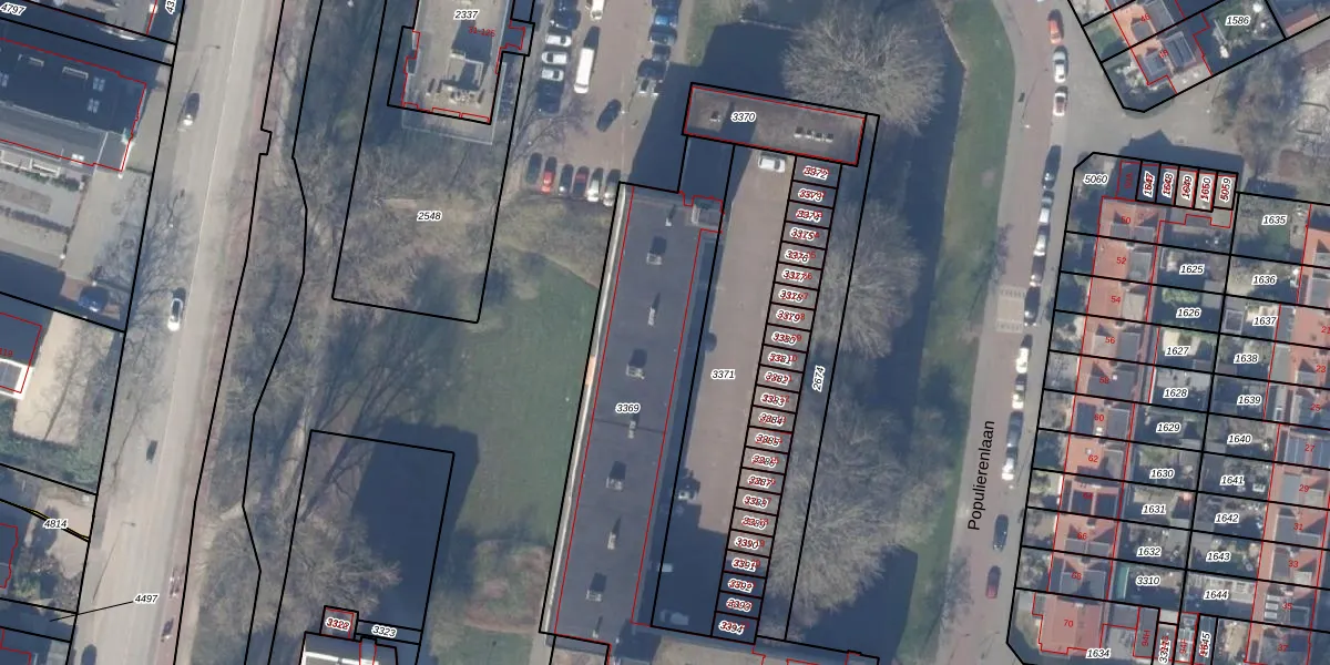Het perceel waarop Populierenlaan 231-33 staat heeft een oppervlakte van 1701 m². Dit is een zeer groot perceel. De perceeloppervlakte wordt geregistreerd door het Kadaster. Gedetailleerde informatie over de maten van dit perceel kunt u vinden in het rapport Kadastrale kaart met maatvoering van Populierenlaan 231-33.