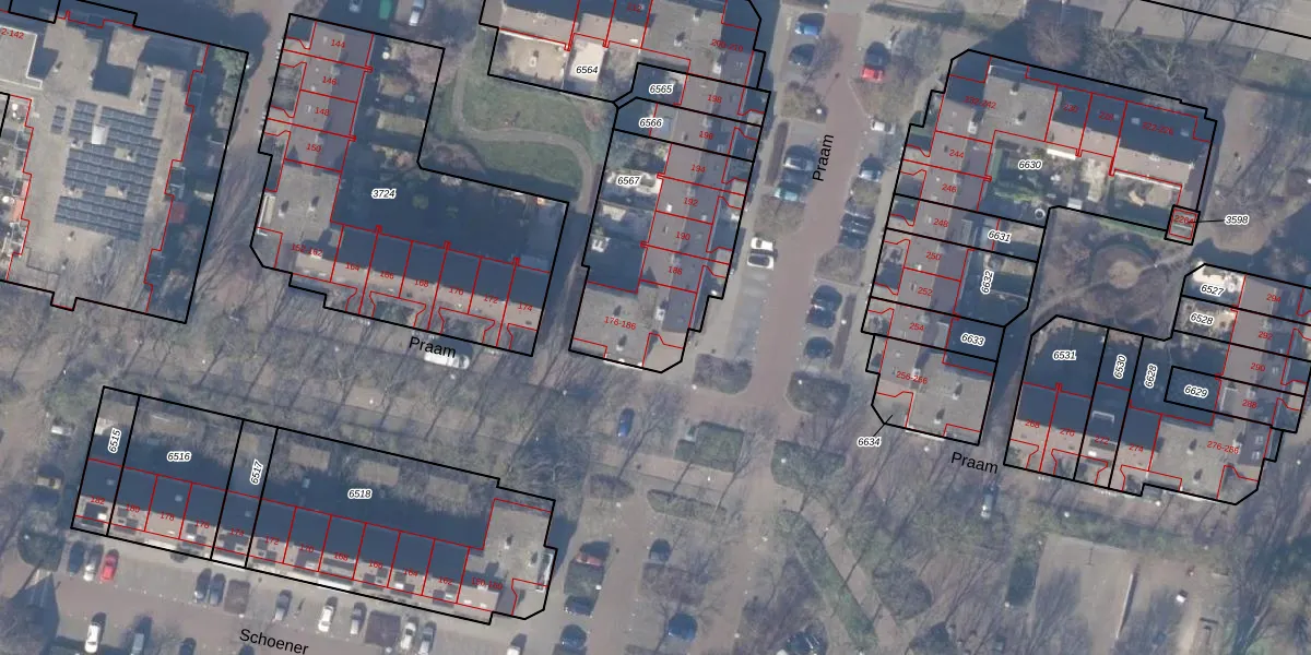 Het perceel waarop Praam 176 staat heeft een oppervlakte van 700 m². Dit is een groot perceel. De perceeloppervlakte wordt geregistreerd door het Kadaster. Gedetailleerde informatie over de maten van dit perceel kunt u vinden in het rapport Kadastrale kaart met maatvoering van Praam 176.