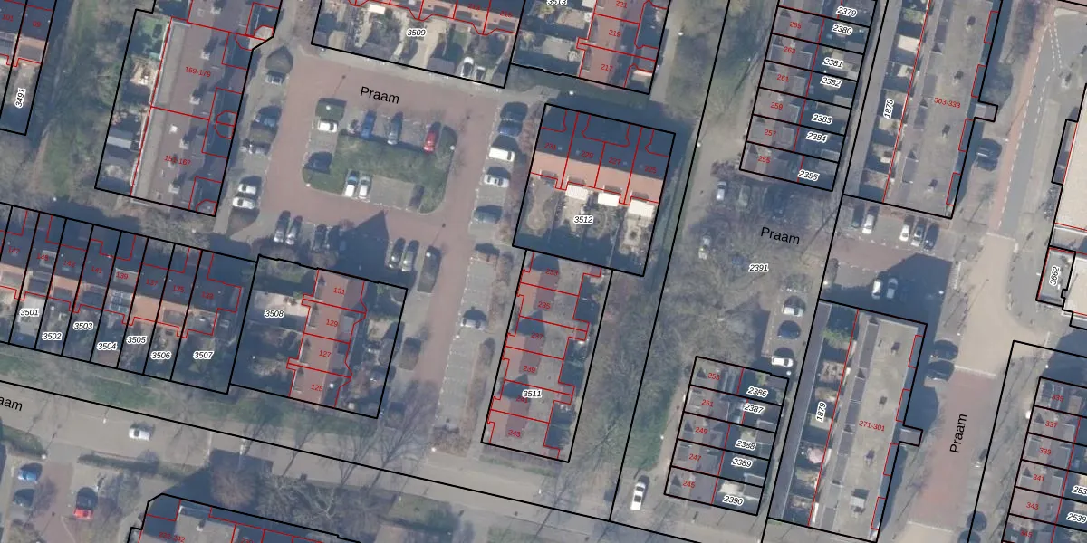 Het perceel waarop Praam 233 staat heeft een oppervlakte van 585 m². Dit is een groot perceel. De perceeloppervlakte wordt geregistreerd door het Kadaster. Gedetailleerde informatie over de maten van dit perceel kunt u vinden in het rapport Kadastrale kaart met maatvoering van Praam 233.