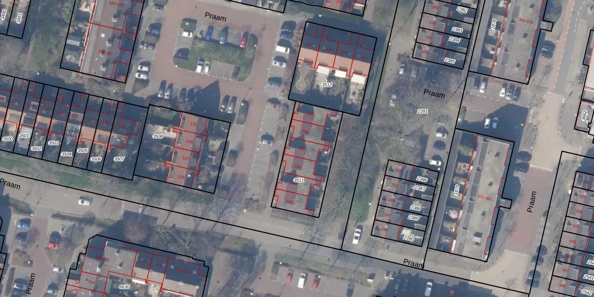 Het perceel waarop Praam 237 staat heeft een oppervlakte van 585 m². Dit is een groot perceel. De perceeloppervlakte wordt geregistreerd door het Kadaster. Gedetailleerde informatie over de maten van dit perceel kunt u vinden in het rapport Kadastrale kaart met maatvoering van Praam 237.
