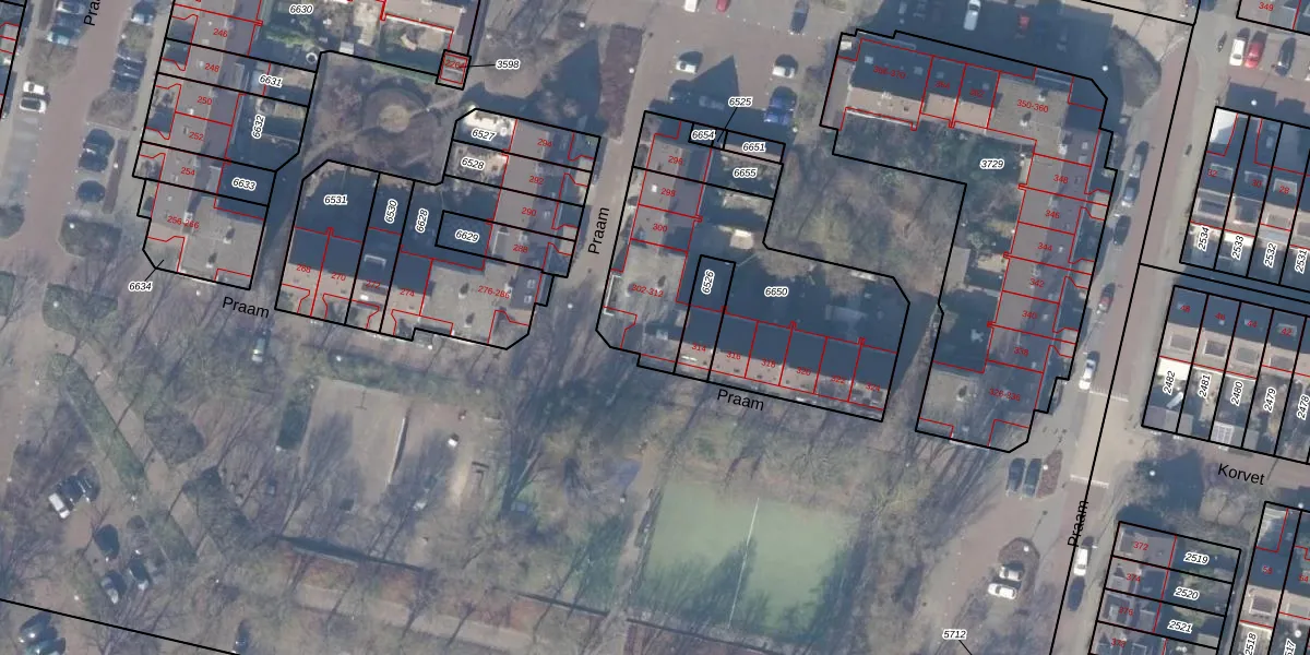 Het perceel waarop Praam 310 staat heeft een oppervlakte van 1045 m². Dit is een zeer groot perceel. De perceeloppervlakte wordt geregistreerd door het Kadaster. Gedetailleerde informatie over de maten van dit perceel kunt u vinden in het rapport Kadastrale kaart met maatvoering van Praam 310.