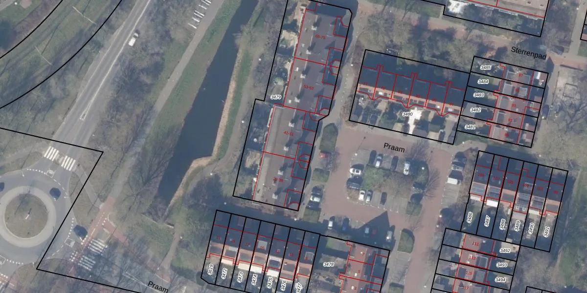 Het perceel waarop Praam 43 staat heeft een oppervlakte van 1615 m². Dit is een zeer groot perceel. De perceeloppervlakte wordt geregistreerd door het Kadaster. Gedetailleerde informatie over de maten van dit perceel kunt u vinden in het rapport Kadastrale kaart met maatvoering van Praam 43.
