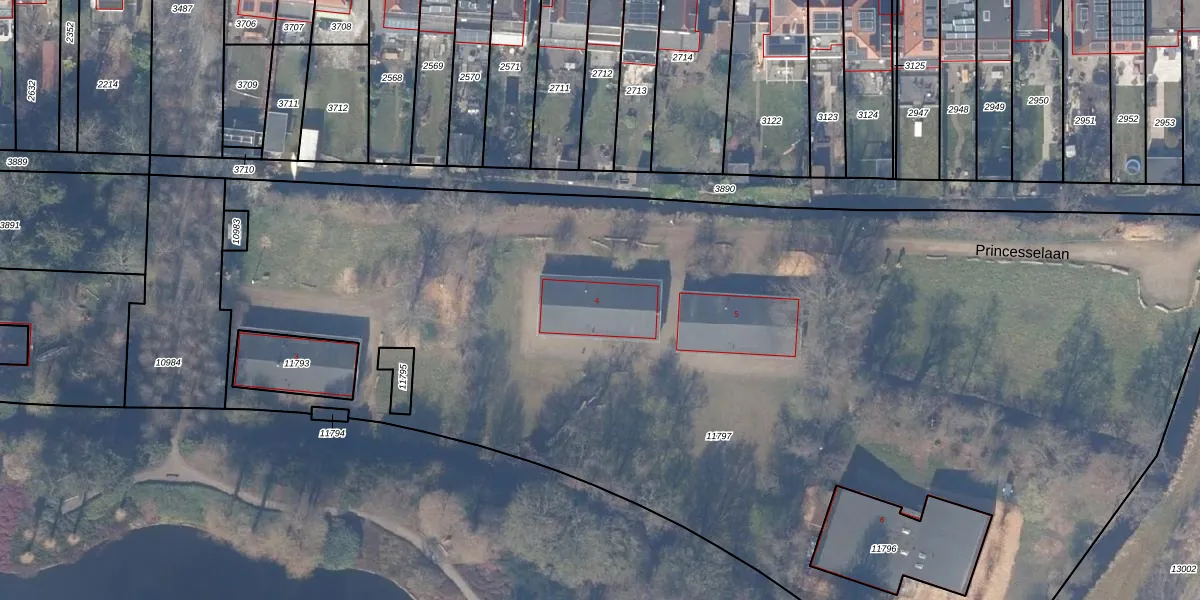 Het perceel waarop Princesselaan 4 staat heeft een oppervlakte van 8623 m². Dit is een zeer groot perceel. De perceeloppervlakte wordt geregistreerd door het Kadaster. Gedetailleerde informatie over de maten van dit perceel kunt u vinden in het rapport Kadastrale kaart met maatvoering van Princesselaan 4.