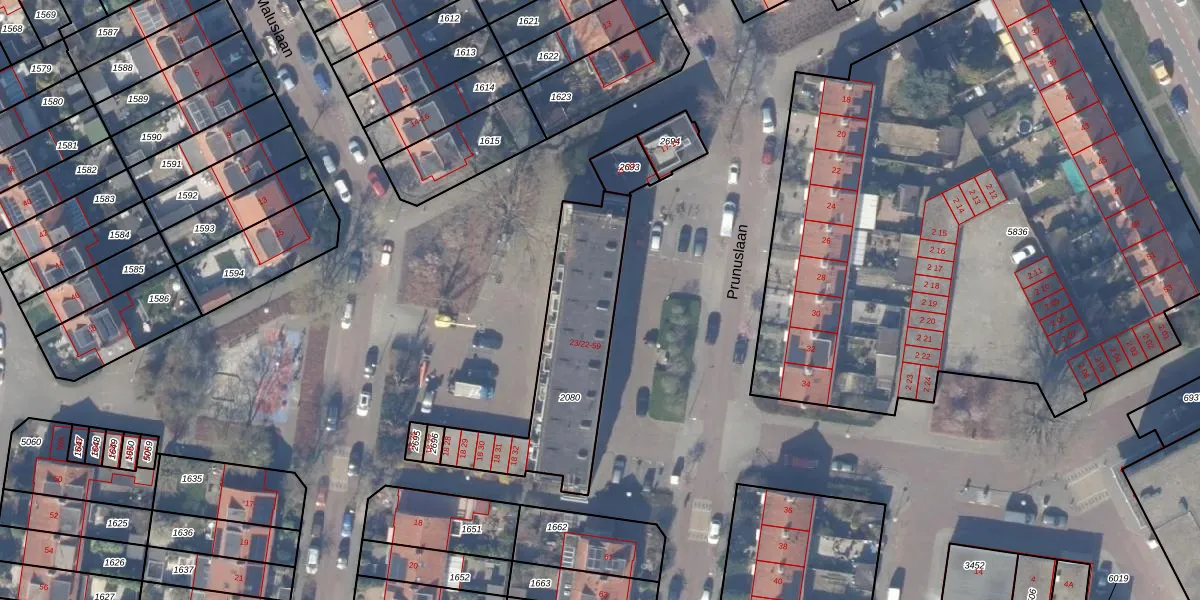 Prunuslaan 23-23 is gelegen op kadastraal perceel ASV00M2080. Deze kadastrale aanduiding is uniek en wordt gebruikt door het Kadaster om eigendomsrechten en andere zakelijke rechten vast te leggen. Het perceel maakt onderdeel uit van de kadastrale gemeente Amstelveen.