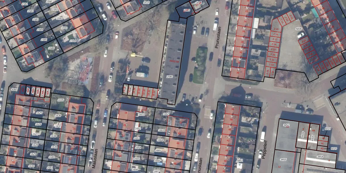 Prunuslaan 23-27 is gelegen op kadastraal perceel ASV00M2080. Deze kadastrale aanduiding is uniek en wordt gebruikt door het Kadaster om eigendomsrechten en andere zakelijke rechten vast te leggen. Het perceel maakt onderdeel uit van de kadastrale gemeente Amstelveen.