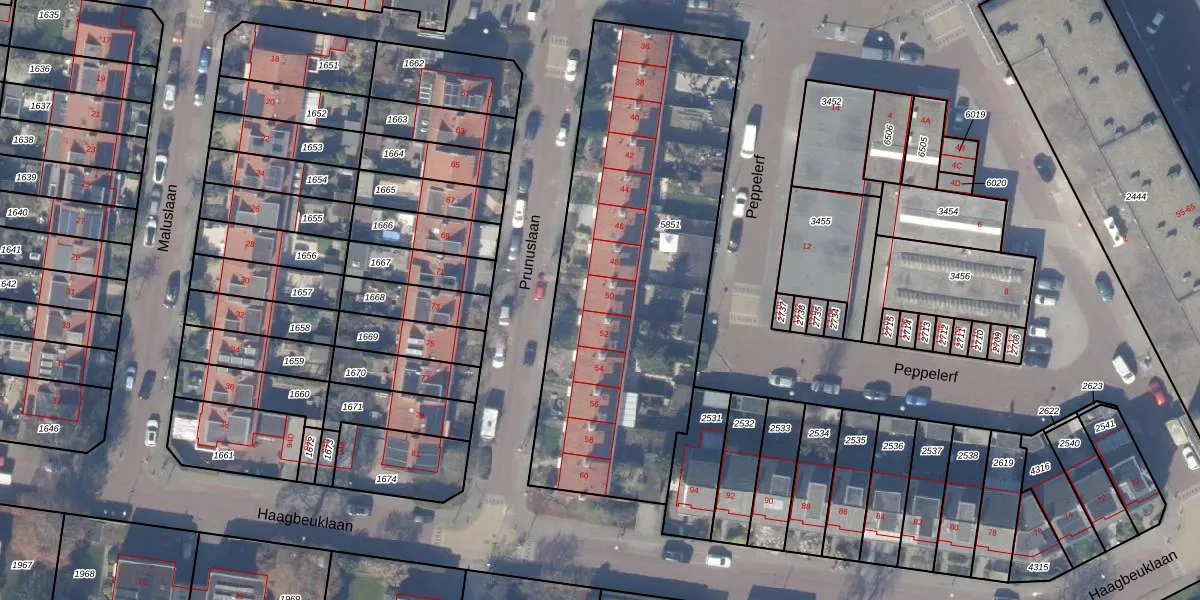 Het perceel waarop Prunuslaan 50 staat heeft een oppervlakte van 1937 m². Dit is een zeer groot perceel. De perceeloppervlakte wordt geregistreerd door het Kadaster. Gedetailleerde informatie over de maten van dit perceel kunt u vinden in het rapport Kadastrale kaart met maatvoering van Prunuslaan 50.