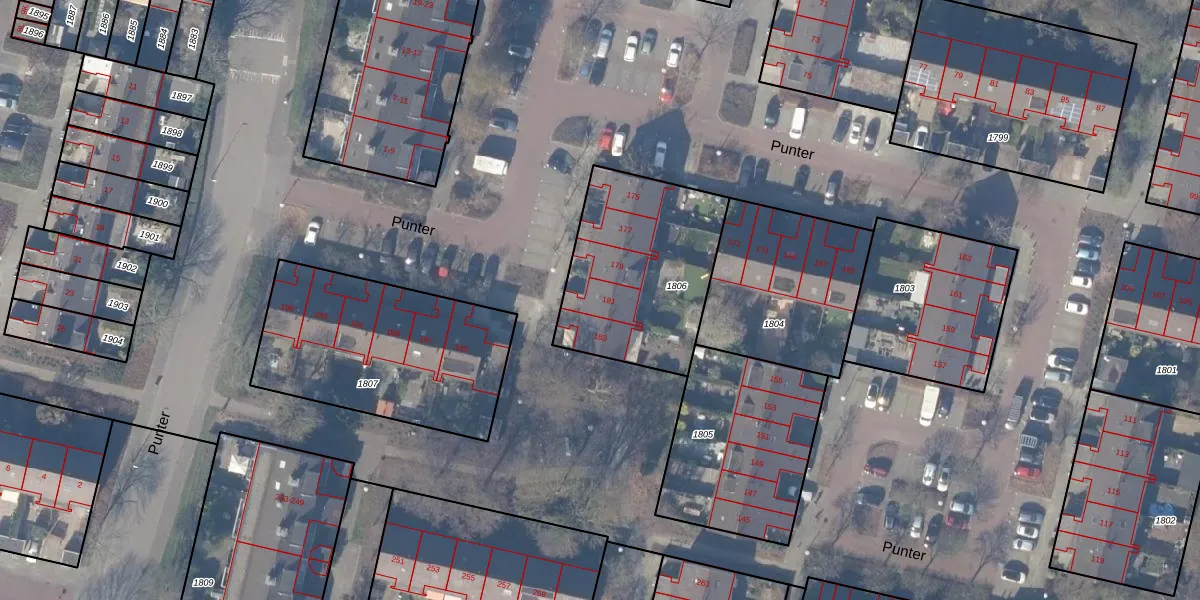 Het perceel waarop Punter 181 staat heeft een oppervlakte van 712 m². Dit is een groot perceel. De perceeloppervlakte wordt geregistreerd door het Kadaster. Gedetailleerde informatie over de maten van dit perceel kunt u vinden in het rapport Kadastrale kaart met maatvoering van Punter 181.