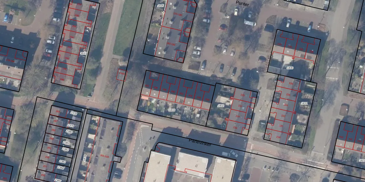 Het perceel waarop Punter 202 staat heeft een oppervlakte van 882 m². Dit is een groot perceel. De perceeloppervlakte wordt geregistreerd door het Kadaster. Gedetailleerde informatie over de maten van dit perceel kunt u vinden in het rapport Kadastrale kaart met maatvoering van Punter 202.