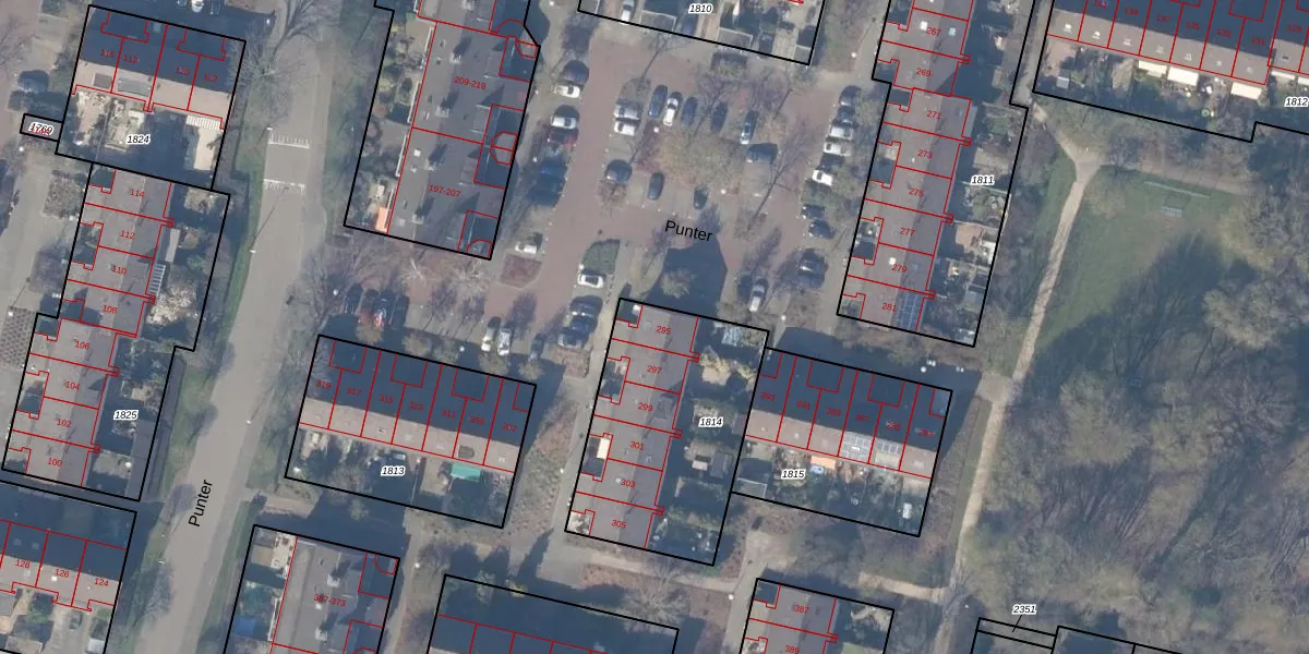 Het perceel waarop Punter 295 staat heeft een oppervlakte van 850 m². Dit is een groot perceel. De perceeloppervlakte wordt geregistreerd door het Kadaster. Gedetailleerde informatie over de maten van dit perceel kunt u vinden in het rapport Kadastrale kaart met maatvoering van Punter 295.