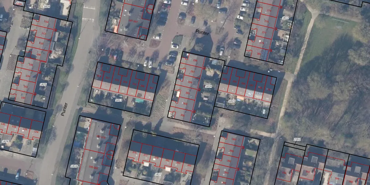 Het perceel waarop Punter 301 staat heeft een oppervlakte van 850 m². Dit is een groot perceel. De perceeloppervlakte wordt geregistreerd door het Kadaster. Gedetailleerde informatie over de maten van dit perceel kunt u vinden in het rapport Kadastrale kaart met maatvoering van Punter 301.