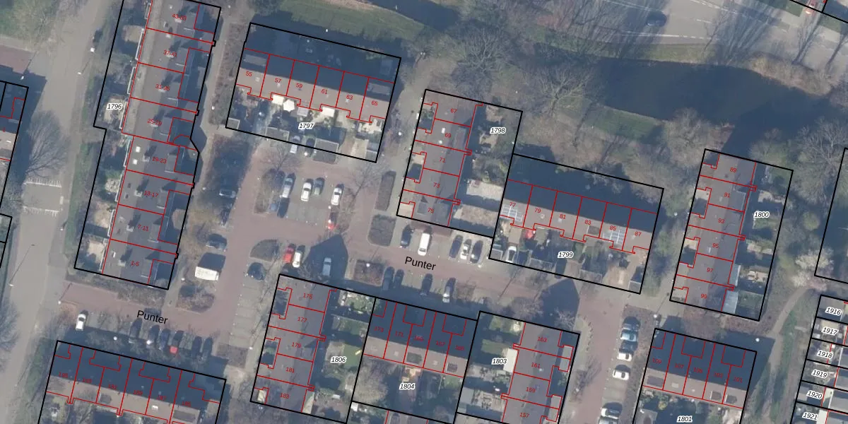 Het perceel waarop Punter 75 staat heeft een oppervlakte van 715 m². Dit is een groot perceel. De perceeloppervlakte wordt geregistreerd door het Kadaster. Gedetailleerde informatie over de maten van dit perceel kunt u vinden in het rapport Kadastrale kaart met maatvoering van Punter 75.