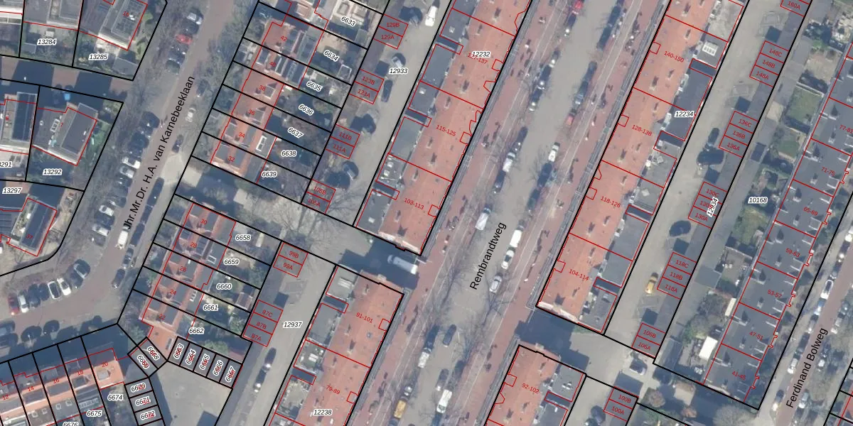 Rembrandtweg 107 is gelegen op kadastraal perceel ASV00H12232. Deze kadastrale aanduiding is uniek en wordt gebruikt door het Kadaster om eigendomsrechten en andere zakelijke rechten vast te leggen. Het perceel maakt onderdeel uit van de kadastrale gemeente Amstelveen.