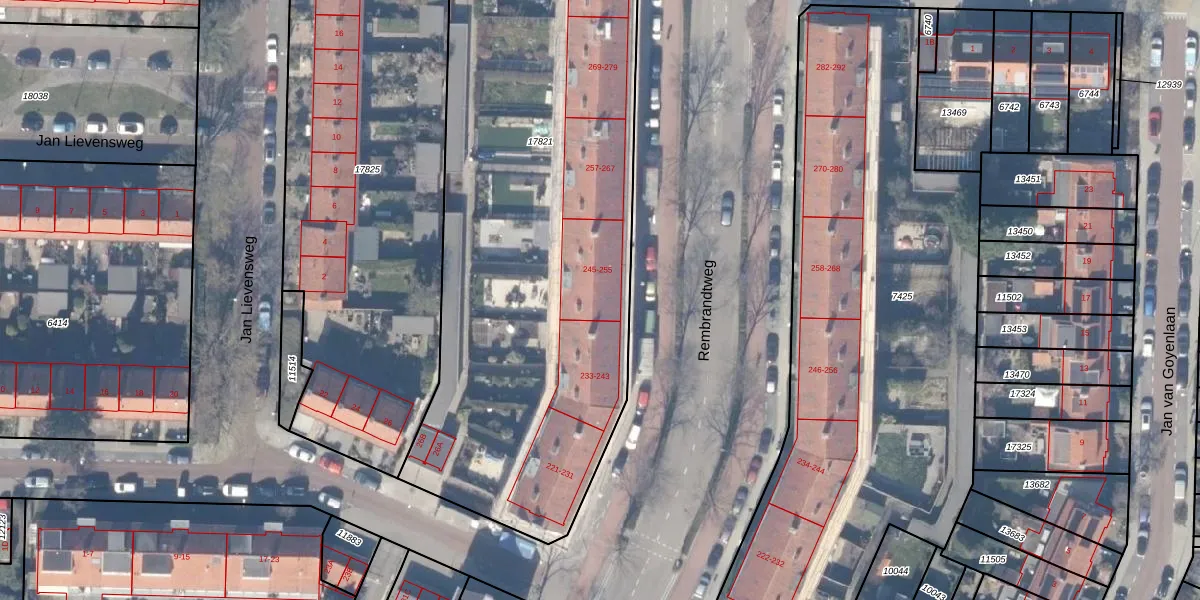 Rembrandtweg 247 is gelegen op kadastraal perceel ASV00H17821. Deze kadastrale aanduiding is uniek en wordt gebruikt door het Kadaster om eigendomsrechten en andere zakelijke rechten vast te leggen. Het perceel maakt onderdeel uit van de kadastrale gemeente Amstelveen.