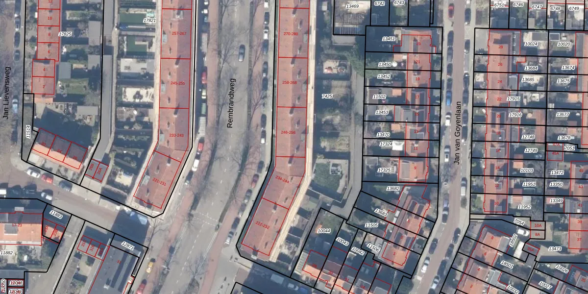 Rembrandtweg 250 is gelegen op kadastraal perceel ASV00H7425. Deze kadastrale aanduiding is uniek en wordt gebruikt door het Kadaster om eigendomsrechten en andere zakelijke rechten vast te leggen. Het perceel maakt onderdeel uit van de kadastrale gemeente Amstelveen.