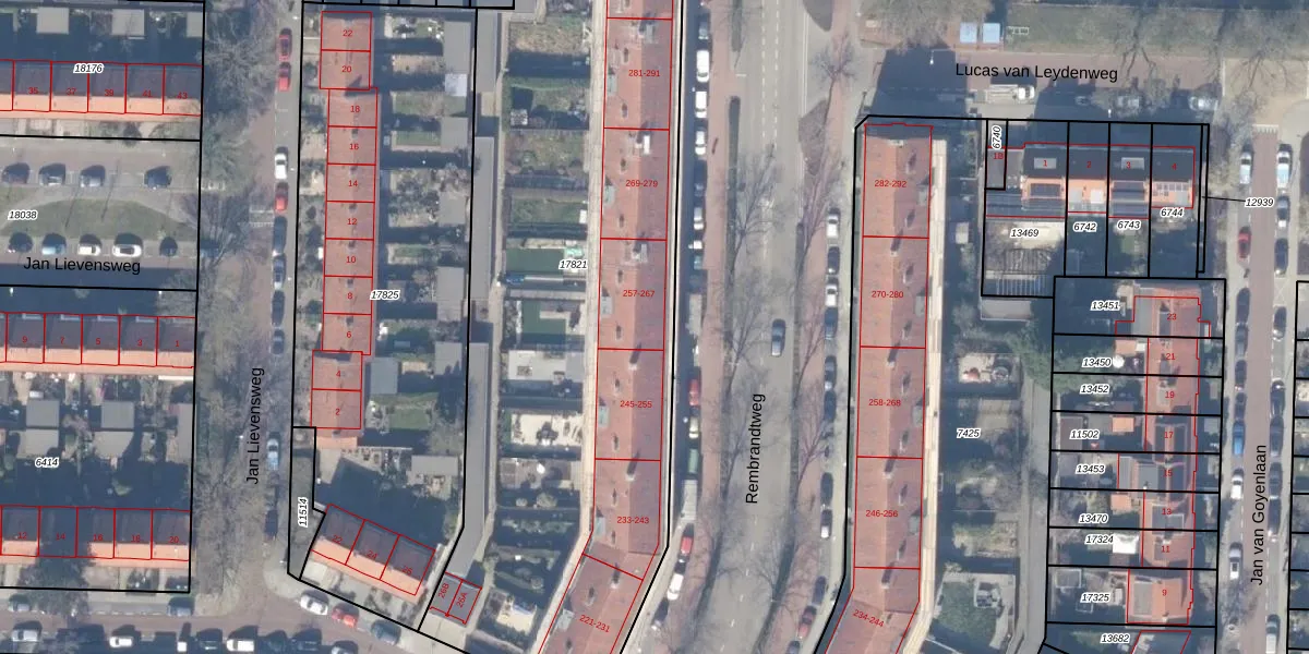 Rembrandtweg 257 is gelegen op kadastraal perceel ASV00H17821. Deze kadastrale aanduiding is uniek en wordt gebruikt door het Kadaster om eigendomsrechten en andere zakelijke rechten vast te leggen. Het perceel maakt onderdeel uit van de kadastrale gemeente Amstelveen.