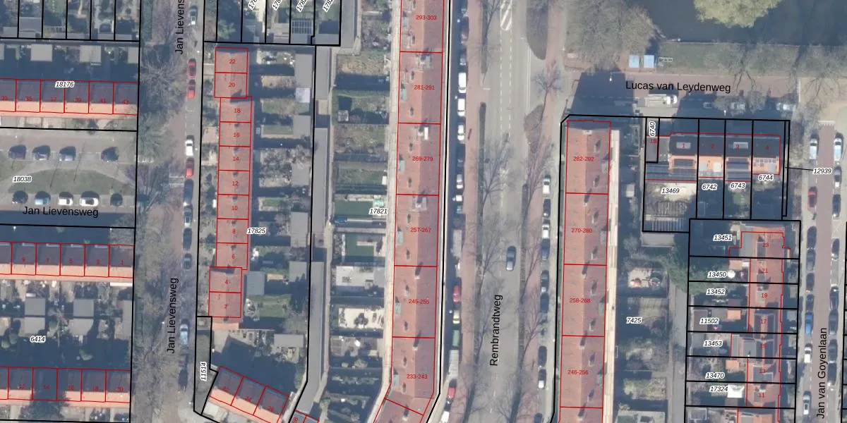 Rembrandtweg 265 is gelegen op kadastraal perceel ASV00H17821. Deze kadastrale aanduiding is uniek en wordt gebruikt door het Kadaster om eigendomsrechten en andere zakelijke rechten vast te leggen. Het perceel maakt onderdeel uit van de kadastrale gemeente Amstelveen.
