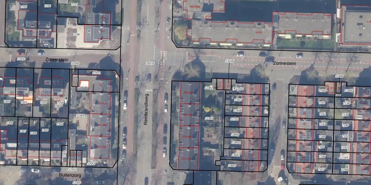 Rembrandtweg 390 is gelegen op kadastraal perceel ASV00H12361. Deze kadastrale aanduiding is uniek en wordt gebruikt door het Kadaster om eigendomsrechten en andere zakelijke rechten vast te leggen. Het perceel maakt onderdeel uit van de kadastrale gemeente Amstelveen.