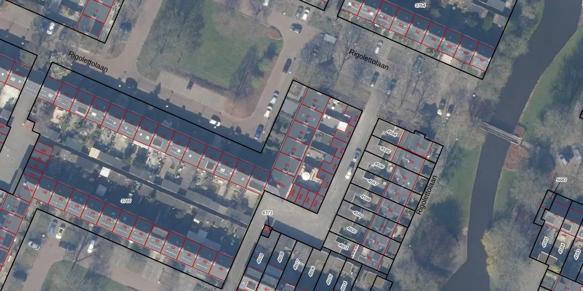 Het perceel waarop Rigolettolaan 43 staat heeft een oppervlakte van 8481 m². Dit is een zeer groot perceel. De perceeloppervlakte wordt geregistreerd door het Kadaster. Gedetailleerde informatie over de maten van dit perceel kunt u vinden in het rapport Kadastrale kaart met maatvoering van Rigolettolaan 43.