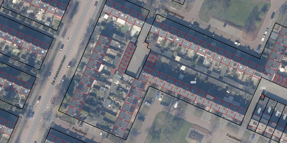 Het perceel waarop Rigolettolaan 9-I staat heeft een oppervlakte van 8481 m². Dit is een zeer groot perceel. De perceeloppervlakte wordt geregistreerd door het Kadaster. Gedetailleerde informatie over de maten van dit perceel kunt u vinden in het rapport Kadastrale kaart met maatvoering van Rigolettolaan 9-I.